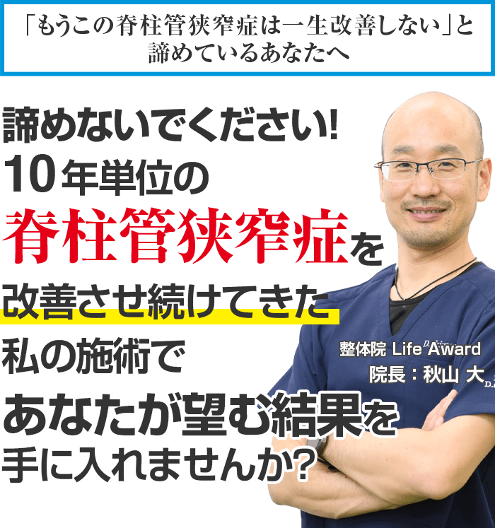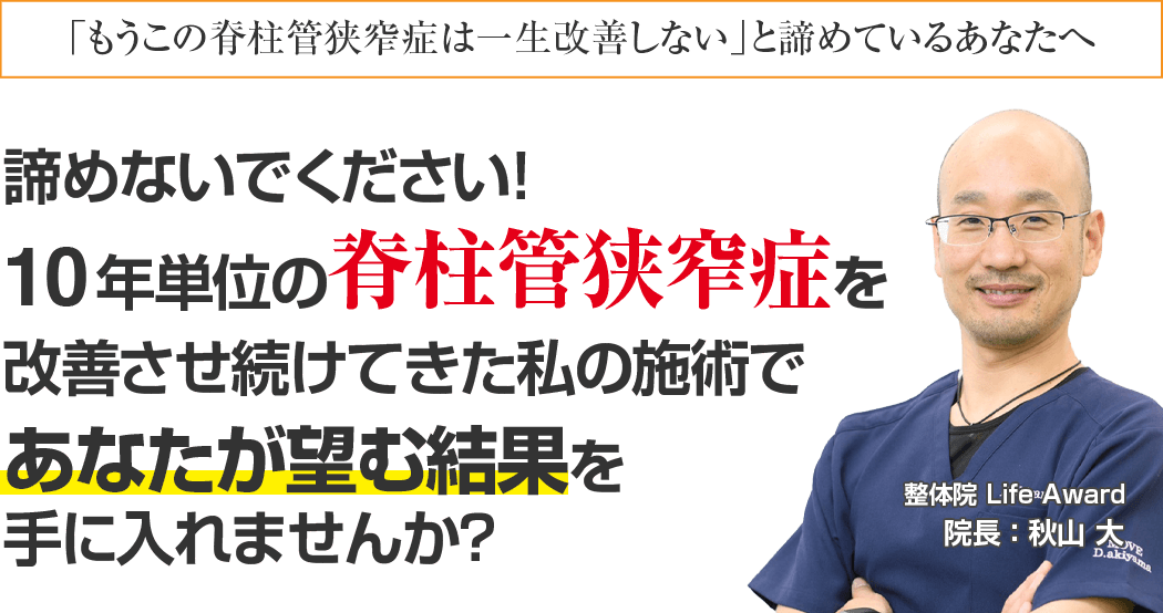 身体のプロとしての証である国家資格を持ち、最先端の技術で、たくさんの脊柱管狭窄症で悩んでいる方から支持され、あなたの辛い症状に全力で向き合ってくれるつくばみどりの中央で唯一の脊柱管狭窄症専門整体院LifeAwardに来院し、もう二度と辛い痛みを我慢することのない人生を手に入れる道。
